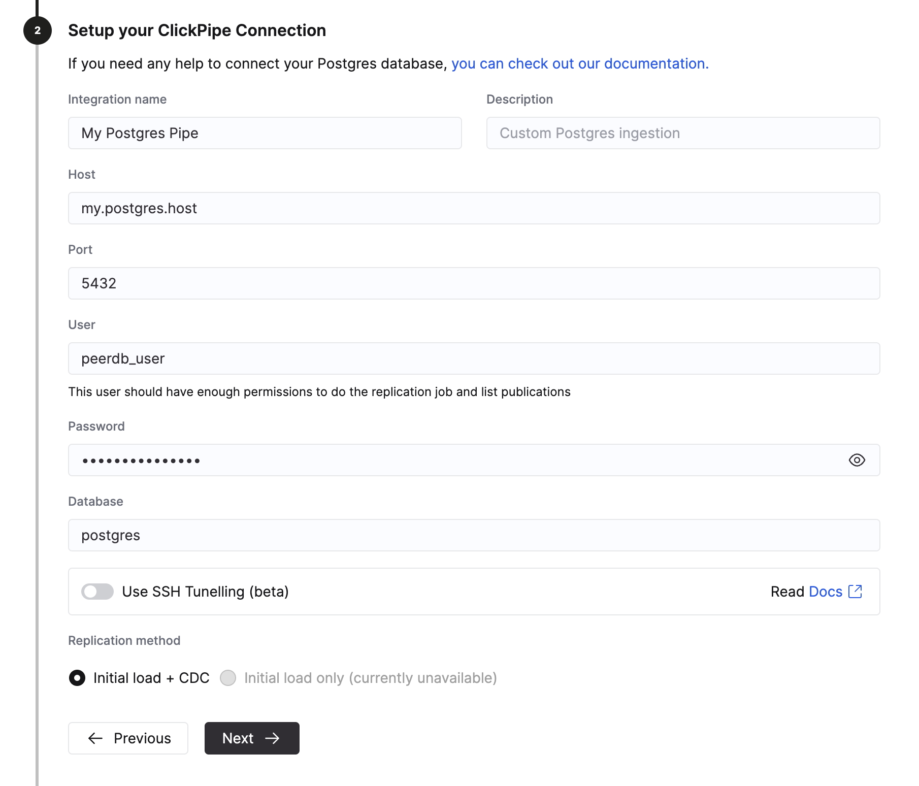 1. Fill in the connection details for your source Postgres database which you configured in the prerequisites step.