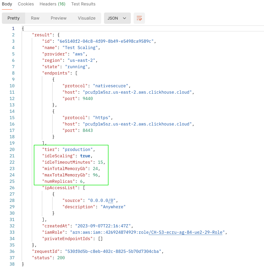 To horizontally scale a cluster, issue a PATCH request via the API to adjust the number of replicas. The screenshots below show an API call to scale out a 3 replica cluster to 6 replicas, and the corresponding response.